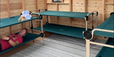 It's a GLAMPOUT! We can pitch you a private tent with a blow up mattress or you can shack up in our heated cedar shed with bunk-bed cots. Think wholesome summer camp vibes!